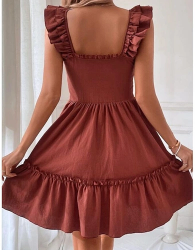 Beau Blue Double Ruffled Sleeves Buttoned A-Line Collared Mini Denim Dress