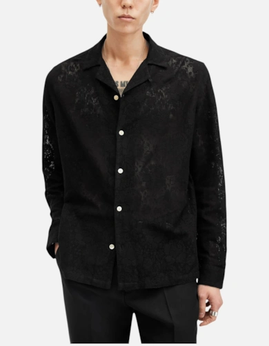 All Saints Mens Shirts Cala Long Sleeve Relaxed Fit Soft Lace Fabric Beach Shirt
