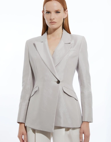 Fluid Tailored Metallic Asymmetric Wrap Blazer