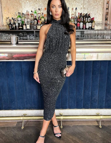 Black Velvet Sequin High Neck Bodycon Mini Dress