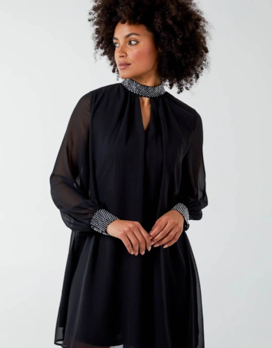 Bandage Collared Knitted Midi Dress With Sheer Sleeve