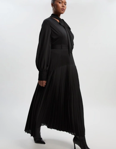 Black High Neck Puff Sleeve Zig Zag Hem Pleated Midi Dress
