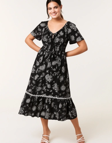 Black Floral V Neck Wrap Long Sleeve Midi Dress