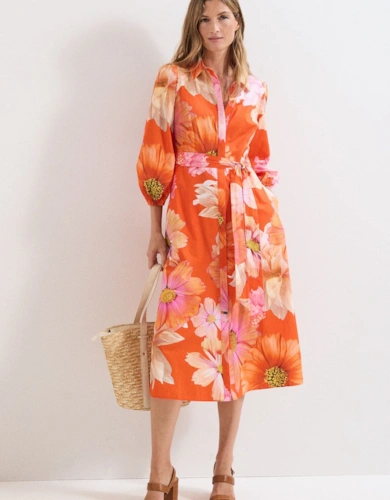 Petite Cotton Puff Sleeve Woven Midi Shirt Dress With Dropped Waist Detail