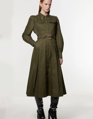 Cotton Sateen Floral Woven Belted Maxi Shirt Dress