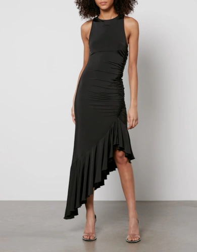 Compact Stretch Asymmetric Neckline Draped Midi Dress