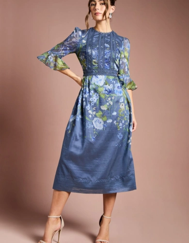 Placement Print 3/4 Sleeve Organza Midi Dress
