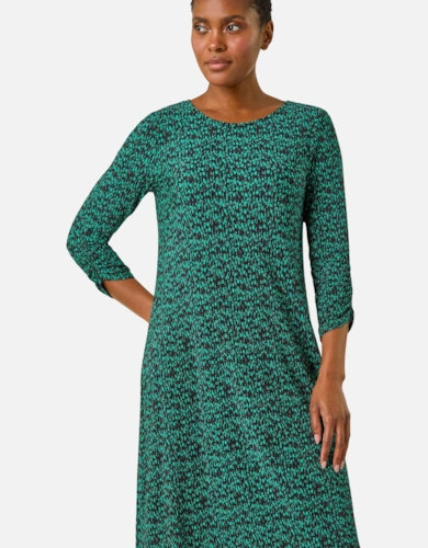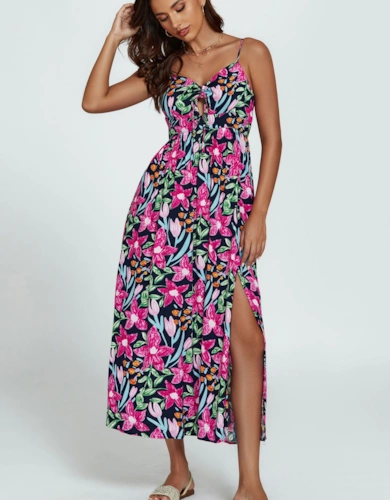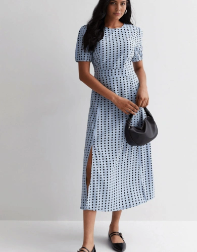 Blue Short Puff Sleeve Split Hem Midi Dress