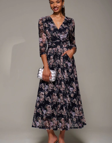 Black Abstract Print Ruched Midi Dress With Long Sleeves