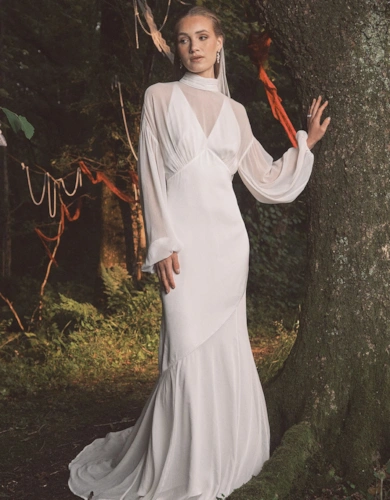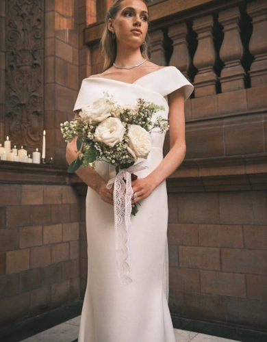 Ruched Shoulder Drape Skirt Crepe Midi Wedding Guest Dress