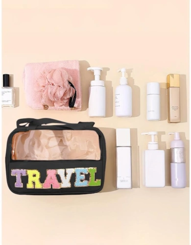 Black Travel Chenille Letter Clear Pvc Makeup Bag