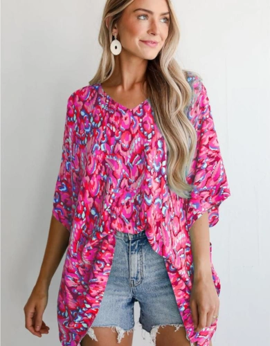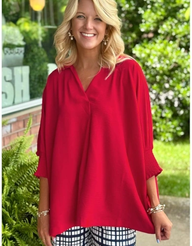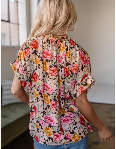 Black Floral 3/4 Flare Sleeve Tied V Neck Blouse