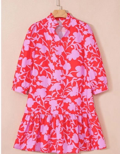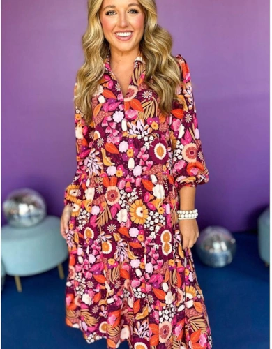 White Floral Print Half Button Mandarin Neck 3/4 Sleeve Maxi Dress