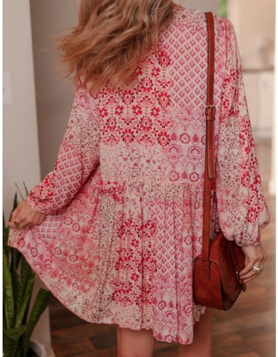Fresh Salmon Floral Print Contrast Striped Trim Polo Collar T Shirt Dress
