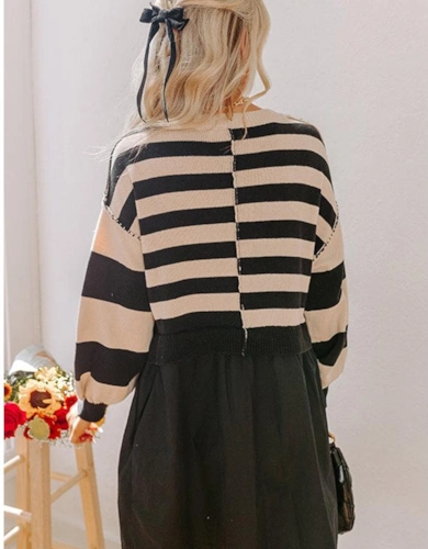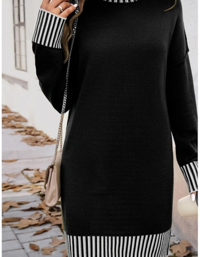 Black Stripe Colorblock Knit Henley Collar Shift Long Sleeve Mini Dress