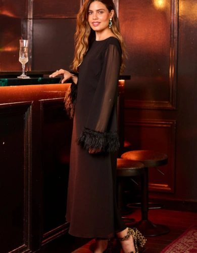 Orange Sequin Cropped Long Sleeve Top With Feather Trim