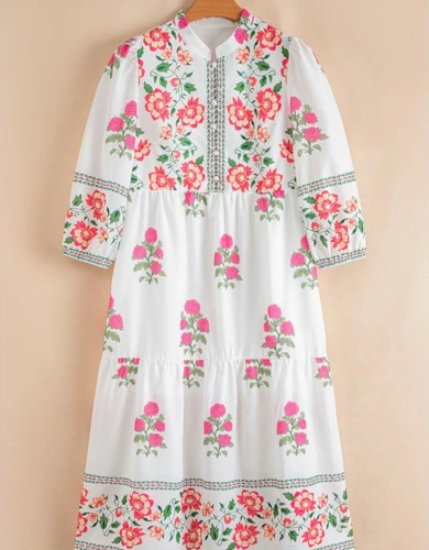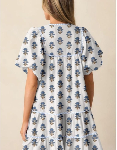 Sky Blue Mixed Floral Print Tie Split Neck Short Sleeve Dress