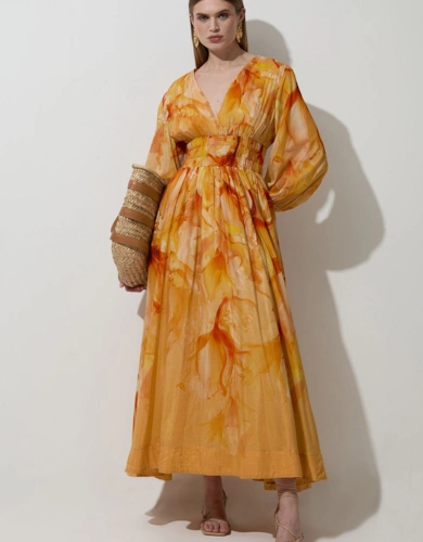 Floral Angel Sleeve Tie Waist Maxi Dress