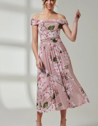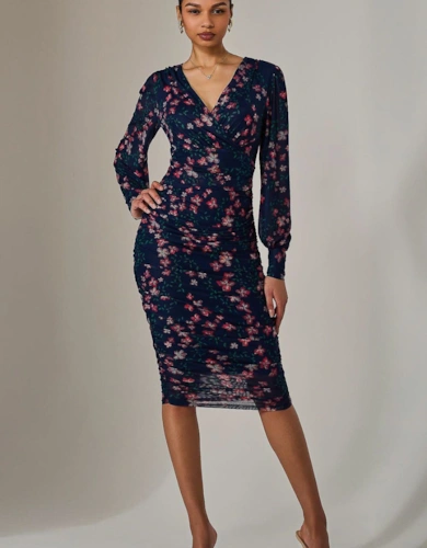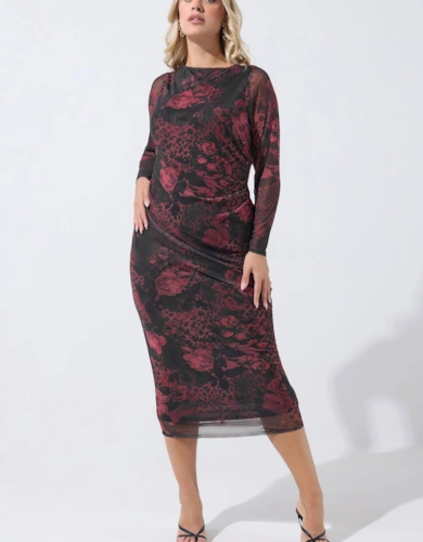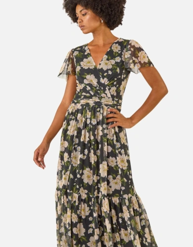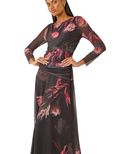 Floral Printed Mesh Ruched One Shoulder Maxi Dress