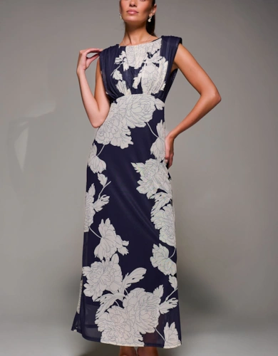 Floral Printed Mesh Ruched Long Sleeve Maxi Dress