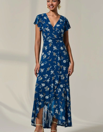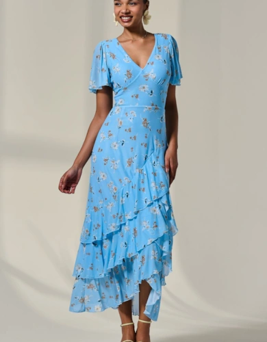 Green Floral Devore Ruffle V Neck Midaxi Dress