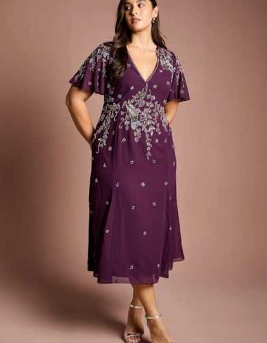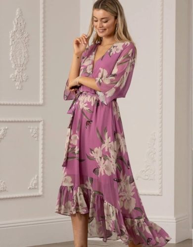 Organdie Ruffle Sleeve Plunge Neck Floral Print Woven Maxi Dress