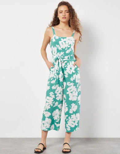 Floral Printed Drapey Jersey Cowl Neck Wide Leg Jumpsuit