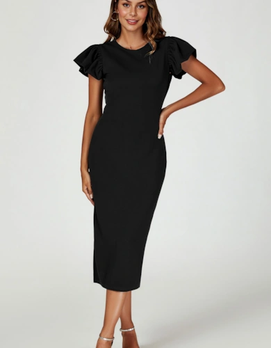 Gold Foil Lace Trim Long Sleeve Midi Dress
