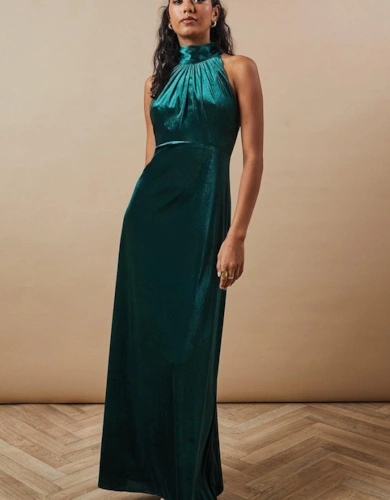 Sequin Power Mesh Lace Up Front Halter Neck Split Detail Maxi Dress
