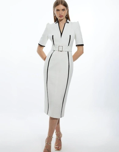 Compact Stretch Viscose Tie Neck Tailored Full Skirted Midi Dress