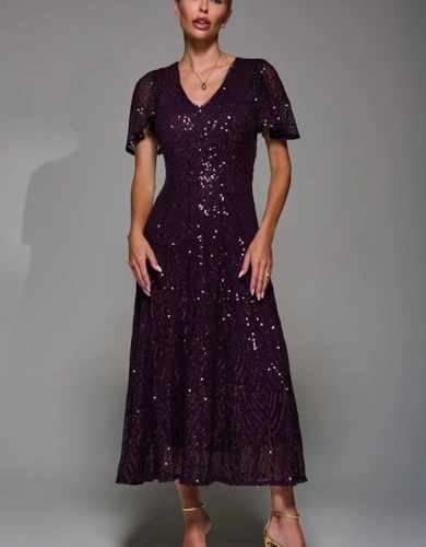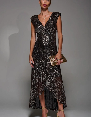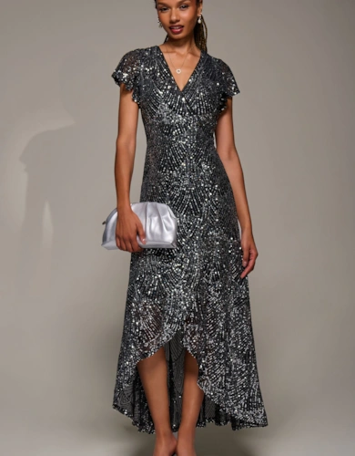 Sequin Angel Sleeve Ruffle Hem Maxi Dress