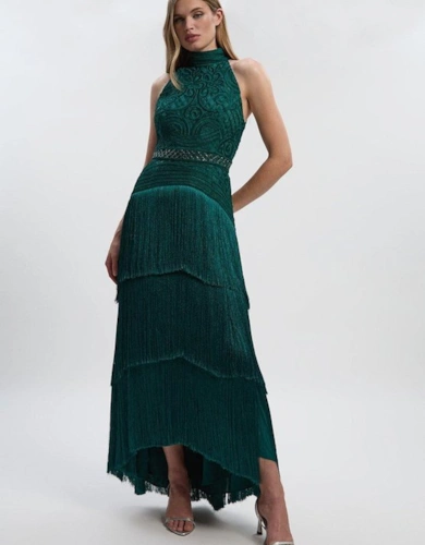 Figure Form Bandage Knit Silk Ruffle Shoulder Detail Maxi Dress
