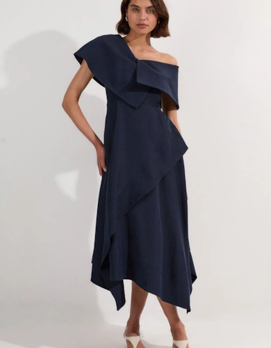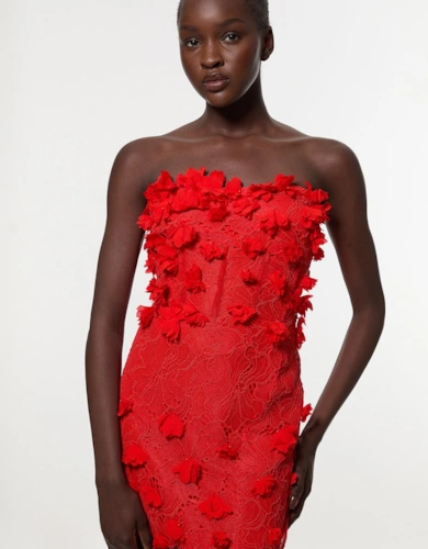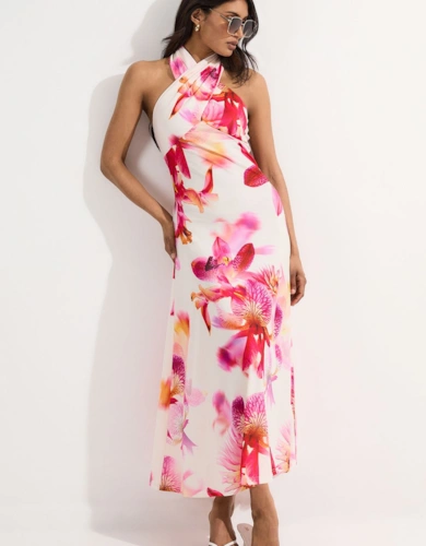 Viscose Linen Placed Floral Lace Embroidered Strappy Midi Dress