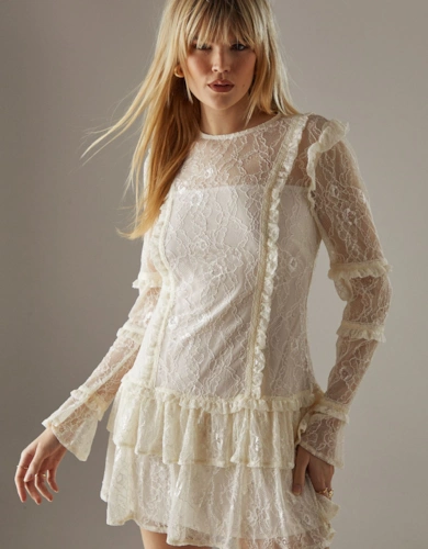 Cotton With Lace Trim Insert Woven Long Sleeve Midi Dress
