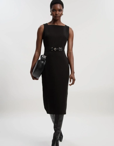 Petite Premium Linen Tab Waist Detail Full Skirt Tailored Midi Dress