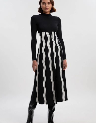 Contrast Wave Knit A-Line Knitted Long Sleeve Dress