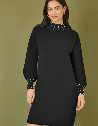 Green Pearl Detail Knitted Relaxed Jumper Dress