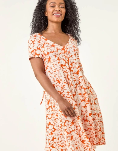 Floral Print Satin Crepe Woven Angel Sleeve Midi Dress