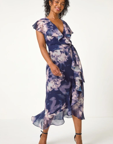 Petite Viscose Floral V Neck Puff Sleeve Midi Dress