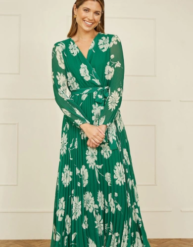 Burgundy Mirror Floral Design Pleated Midi Dress
