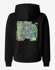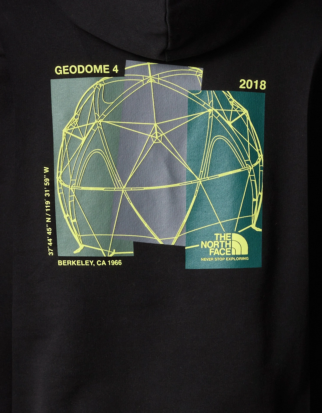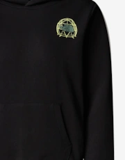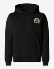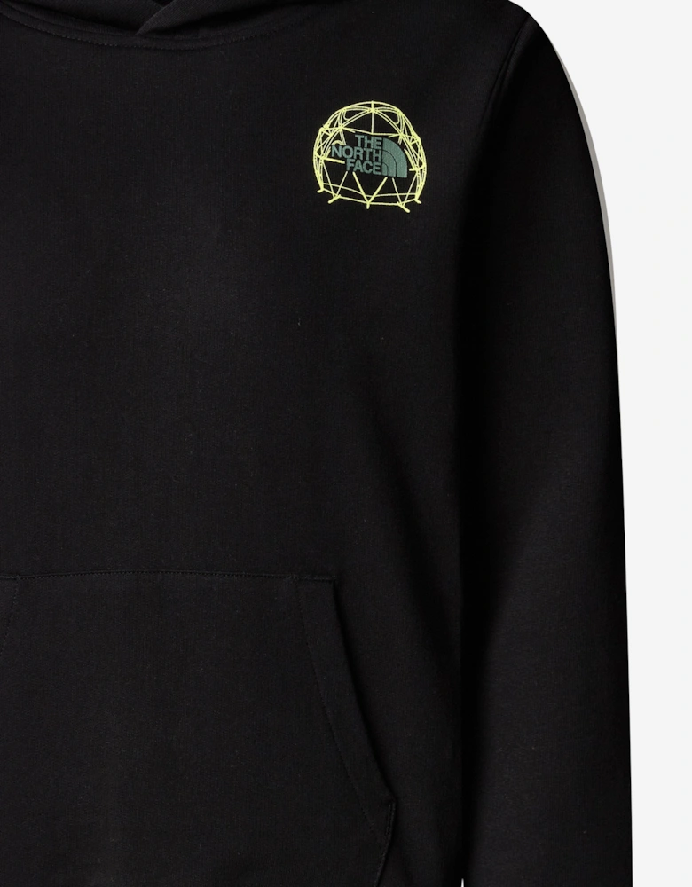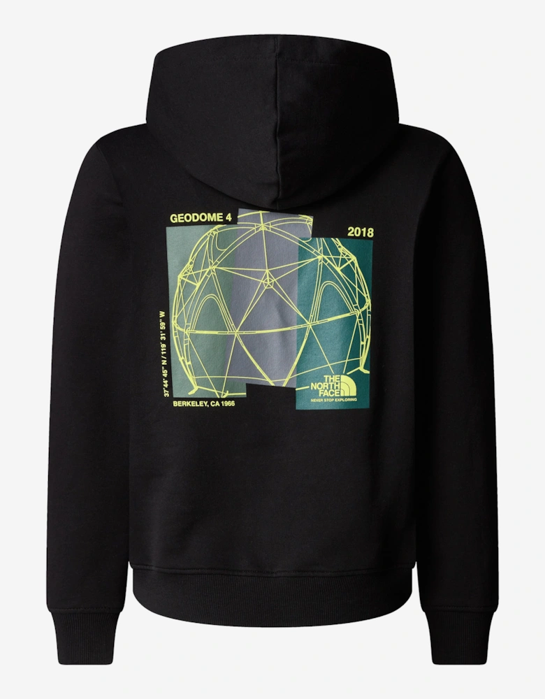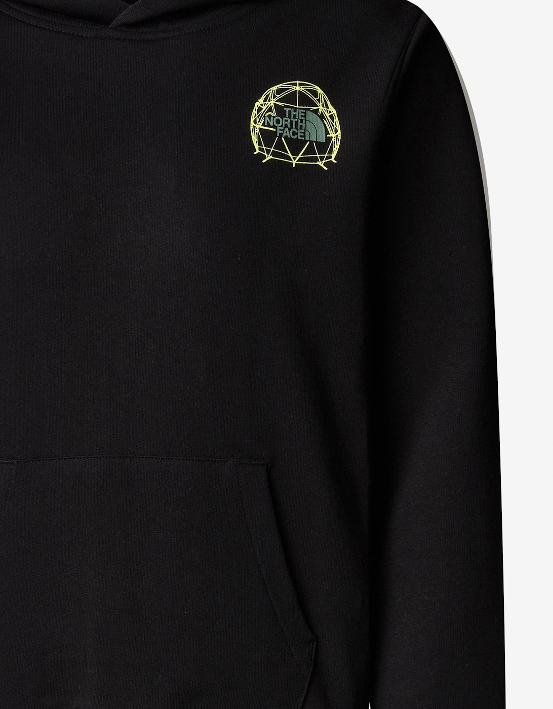 The North Face Boys Graphic Relaxed Hoodie in Black features a sleek design with long sleeves, ribbed details, and a kangaroo pocket. Made from 100% loopback knit cotton, it showcases a distinctive graphic on the chest and an enlarged one on the back.