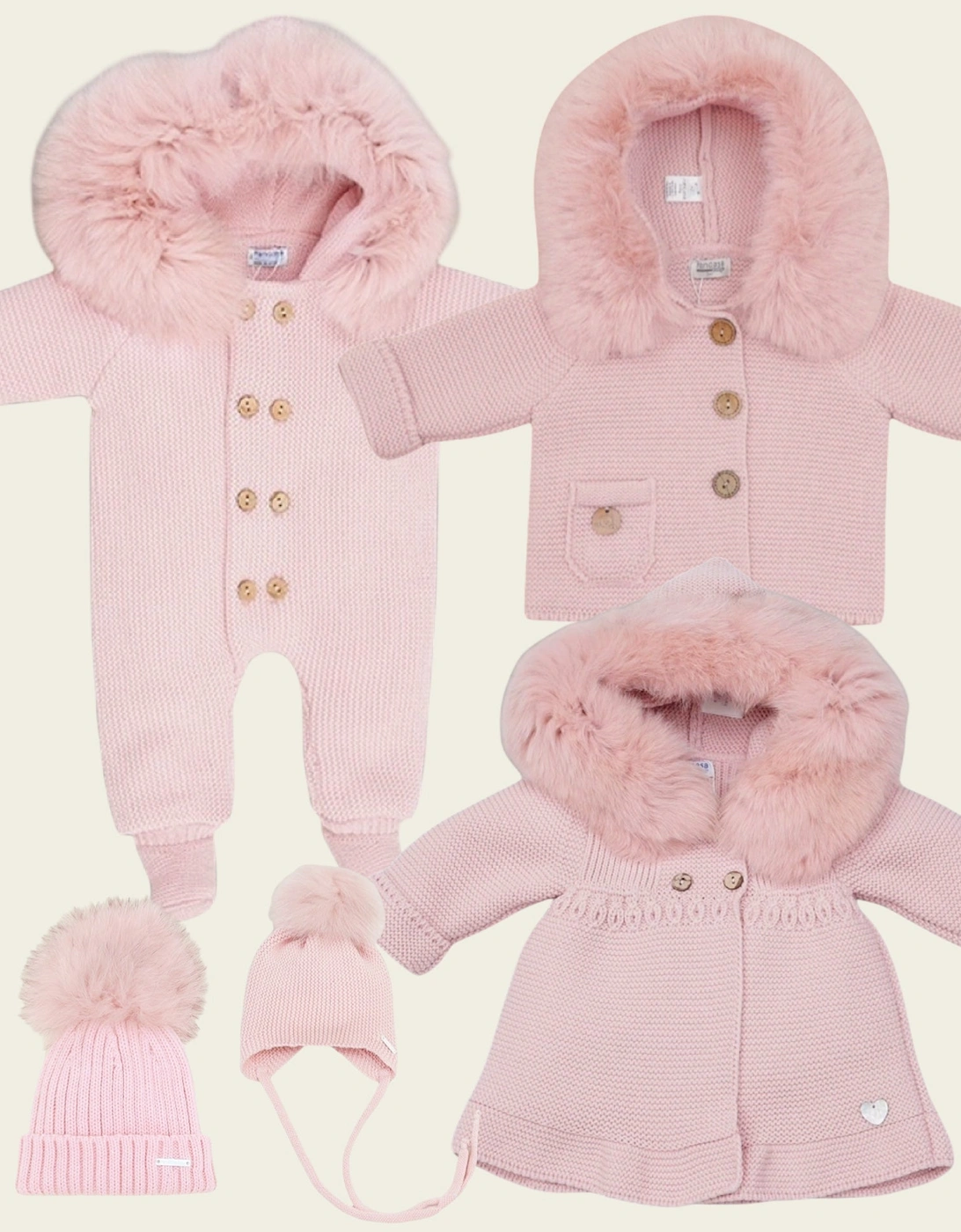 Stylish powder pink knit A line cardigan featuring luxurious faux fur details, perfect for adding warmth and elegance to your outfit.