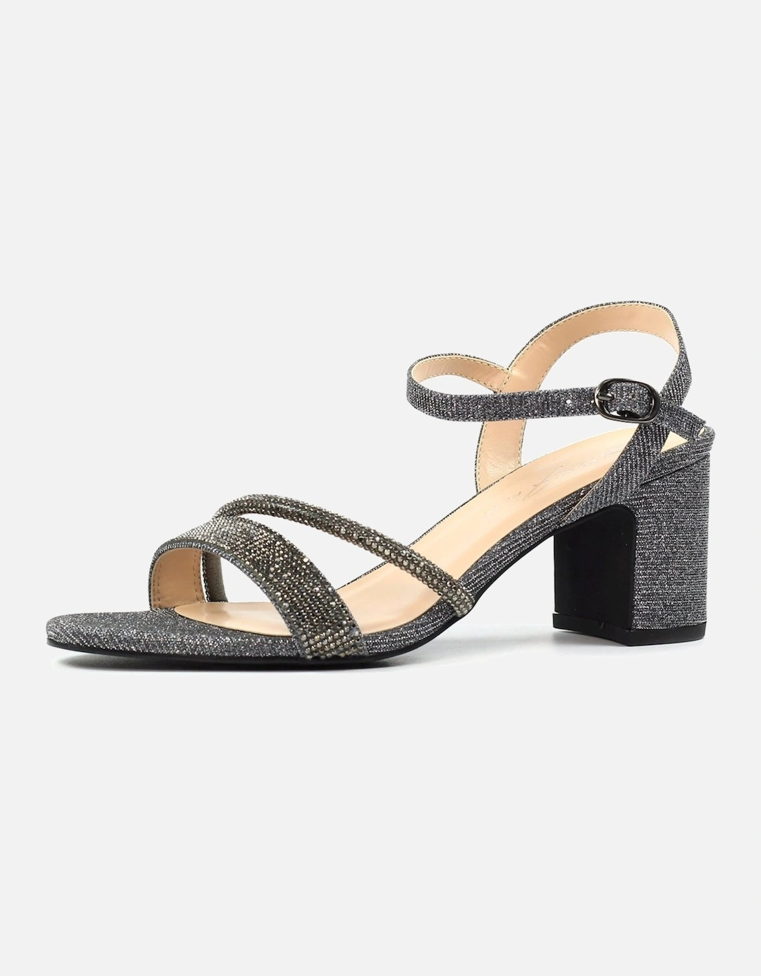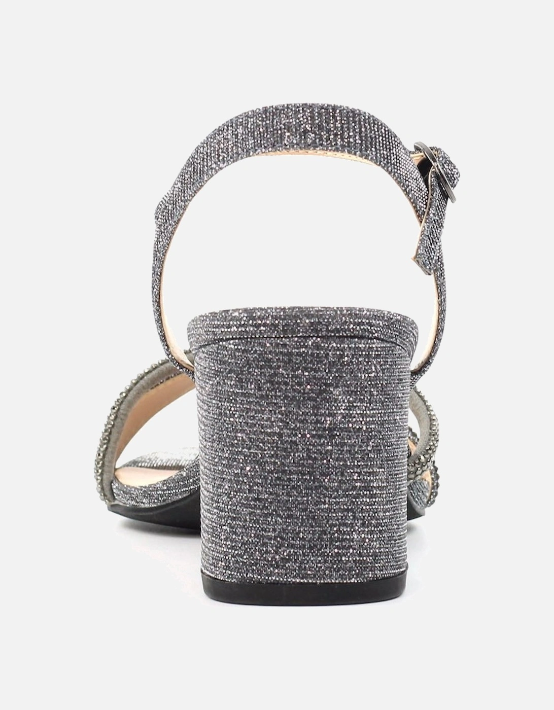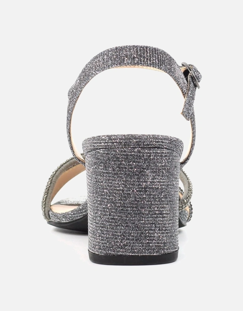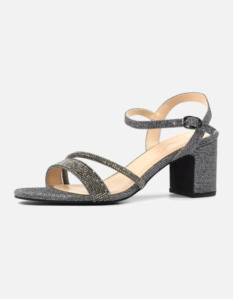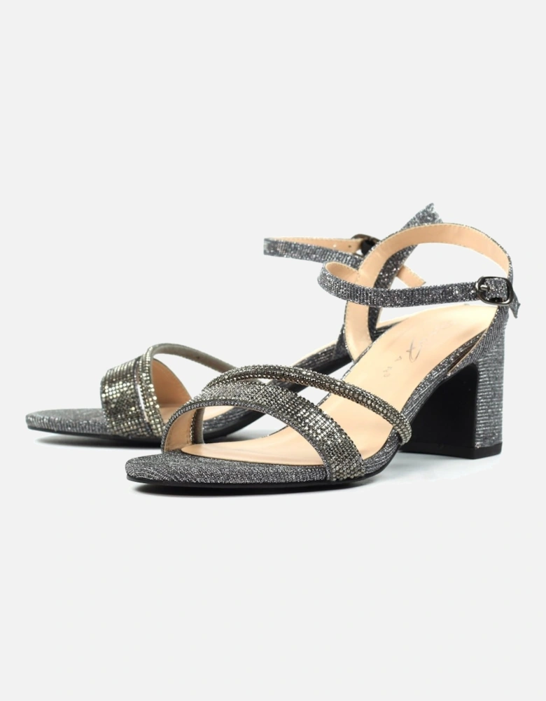 Shazam Womens Sandals feature a stylish block heel with glitter embellishments and a secure adjustable ankle strap for a comfortable fit.