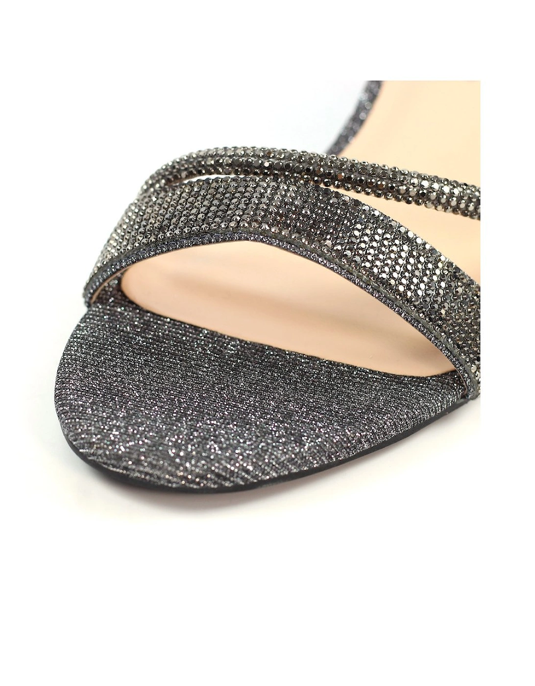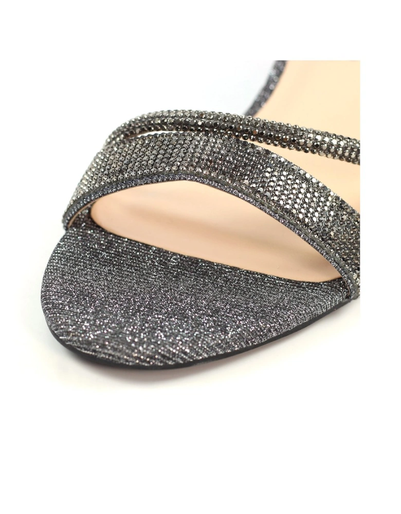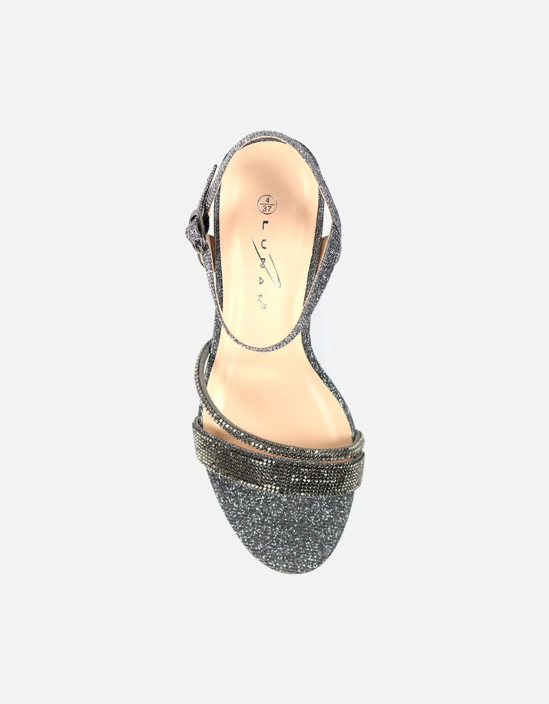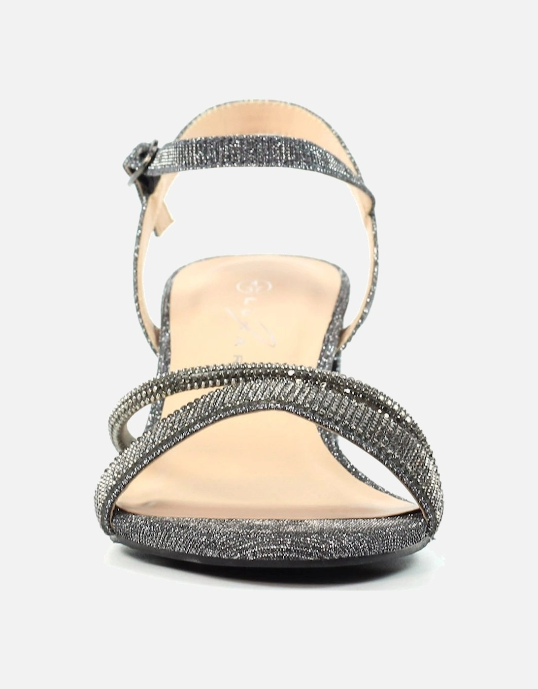 Shazam Womens Sandals feature a stylish block heel with glitter embellishments and a secure adjustable ankle strap for a comfortable fit.