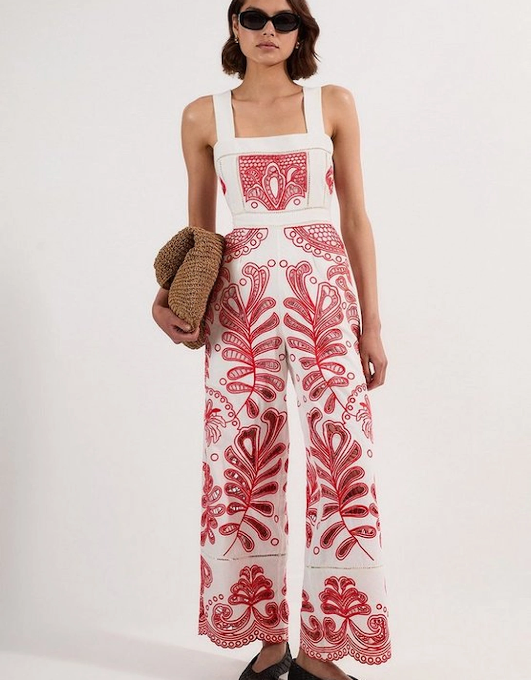 Product code: BKK25272 Style Notes This Karen Millen petite jumpsuit combines artisanal craftsmanship with modern styling. The standout cutwork embroidery creates a striking visual impact, while the wide leg cut offers both comfort and sophistication. The bandeau neckline frames the décolletage, making it perfect for warm-weather socialising. This versatile piece transitions seamlessly from family brunches to garden parties, offering a refined yet relaxed aesthetic that's ideal for the fashion-forward woman who appreciates distinctive detailing and contemporary silhouettes. Striking cutwork embroidery with intricate floral and botanical motifs Bandeau neckline with wide supportive straps Flattering wide leg silhouette Square back design Details & Care Main 100% Polyester, Lining 100% Polyester Do not machine wash, Do not tumble dry. Dry Clean Only.