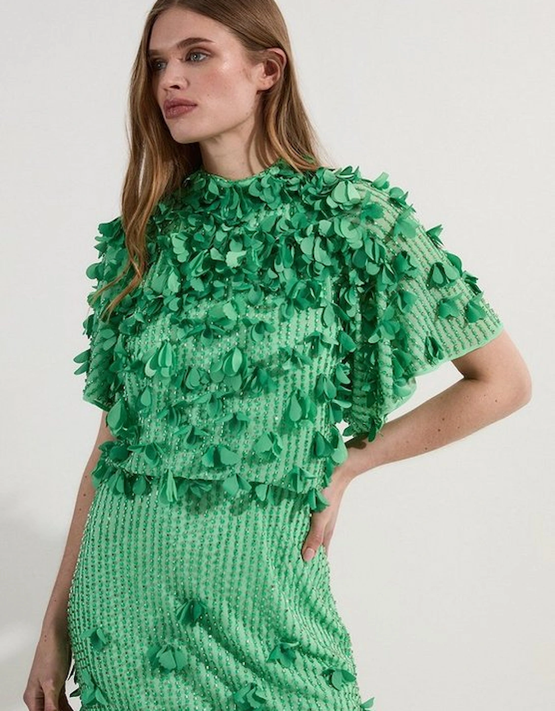 Product code: BKK11208 Style Notes This extraordinary Karen Millen maxi dress transforms any formal occasion into a memorable fashion moment. The woven fabric provides structure while the crystal appliqué detailing catches the light with every movement, creating a mesmerising effect that demands attention. The angel sleeves offer a flattering silhouette while the funnel neckline adds a contemporary touch to this timeless piece. Crystal appliqué detailing Angel sleeves Funnel neckline Maxi length Intricate embellishments from bodice to hem Details & Care 100% polyester. Gentle machine wash at 30 with similar colours. Model Height 5''10 - Model wears a UK 8/US Size 6. Centre back length of a 10: 135cm
