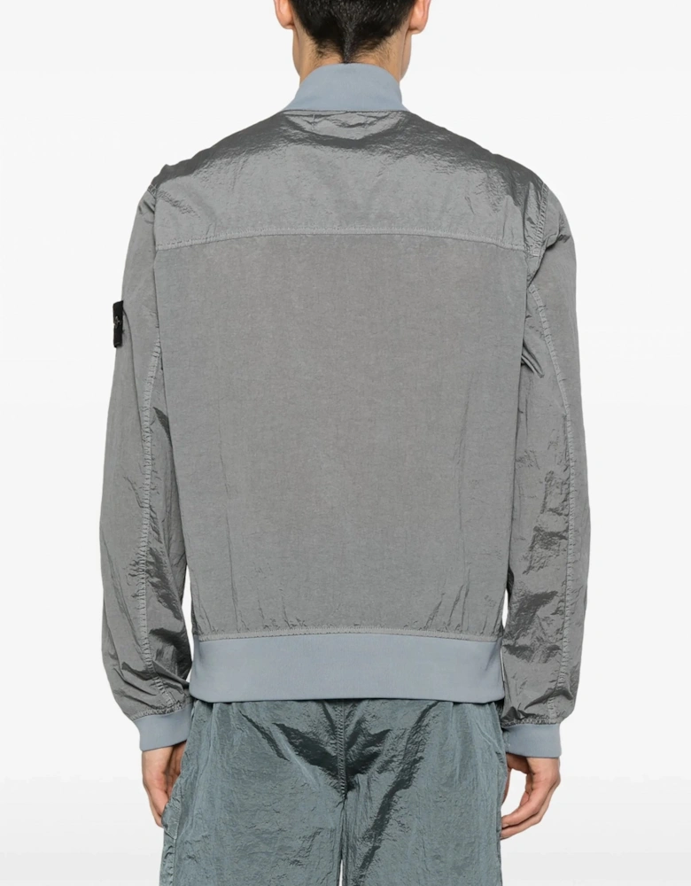 Stone Island bomber jacket with a fitted waist and ribbed cuffs, featuring a zip-up front and two zipped pockets, complete with a detachable compass badge.