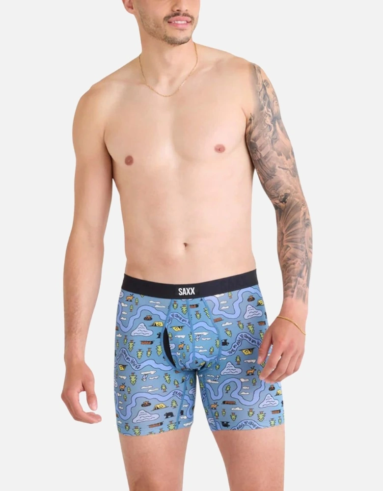 In the SAXX Vibe Xtra range we have the hiking "Take The Trail" print on a blue base in a 6 inch Boxer Brief, which is available in multiple sizes: Small = 30-32 inch waist, Medium = 33-35, Large = 36-38, X-Large = 39-42, XX-Large = 43-46