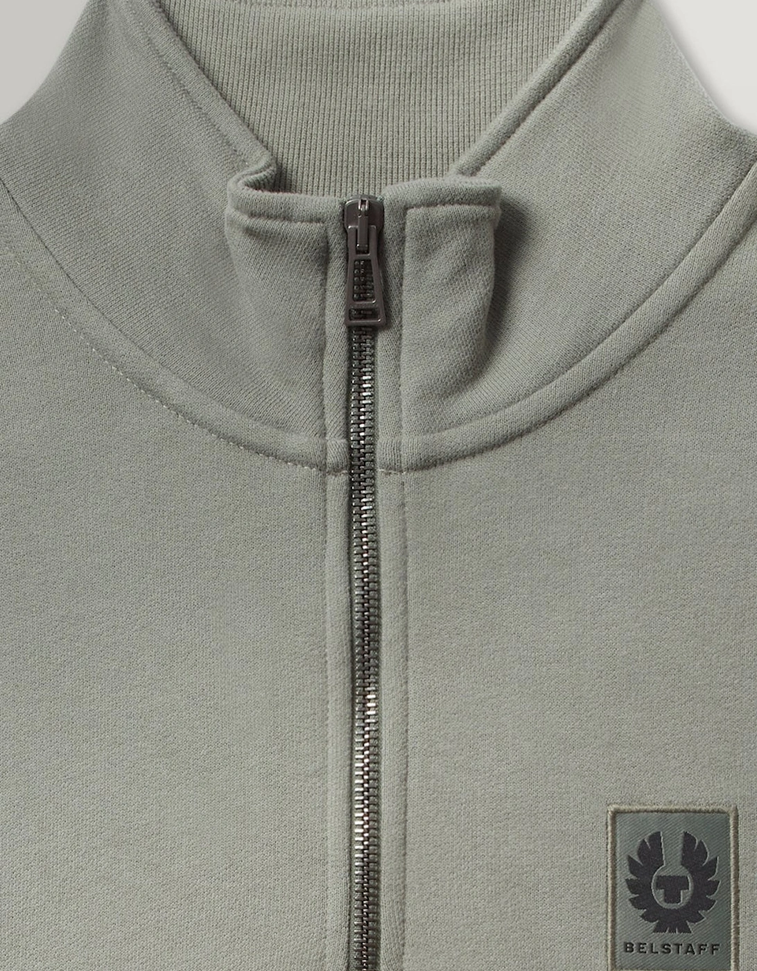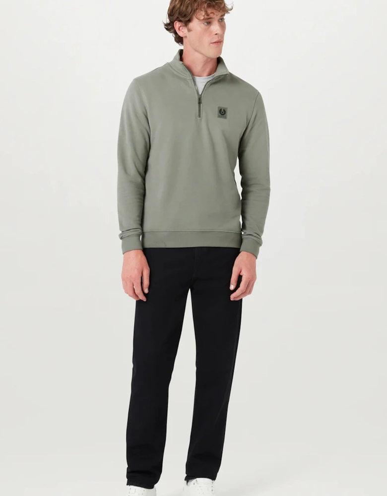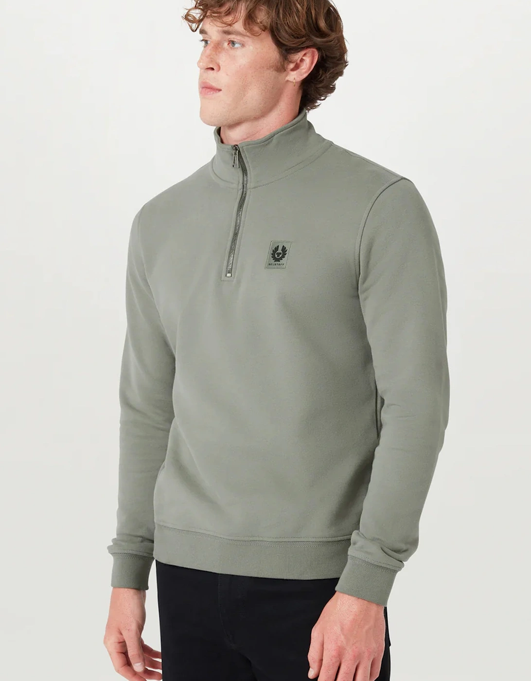 The Belstaff quarter zip in sage green. This simple sweatshirt is crafted from signature Belstaff fleece cotton and features a high zip collar. Finished with the badge of honour on the chest for a signature touch