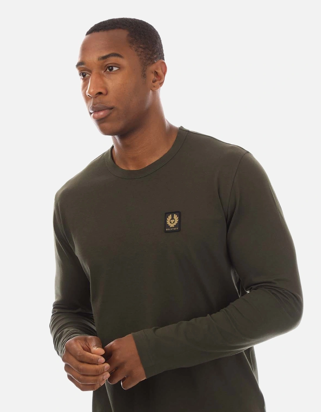 Mens Belstaff Cotton Jersey Long Sleeve T-Shirt featuring a crew neck, long sleeves, and a logo patch at the chest. Made from soft and lightweight 100% cotton for a comfortable slim fit.